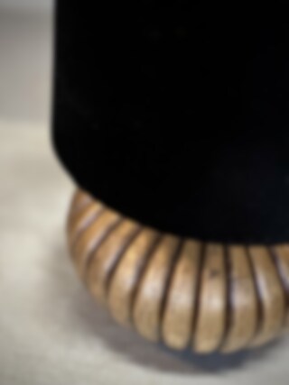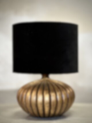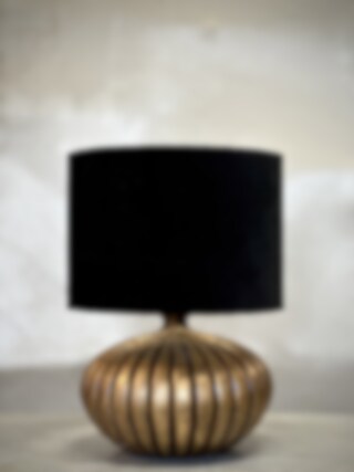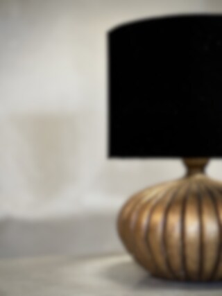 INDAH table lamp in antique gold, is made from mango wood. The shade is straight and made of black velvet. Total hight incl shade 34 cm Lamp Ø 23 x H 18 cm Shade Ø 25 x H 18 cm Socklet E 27