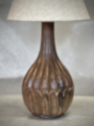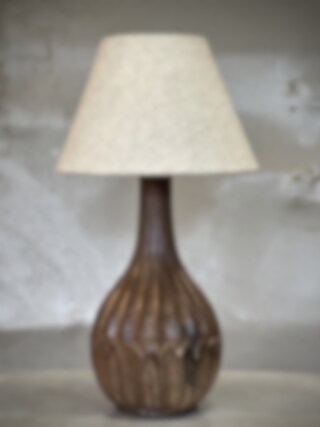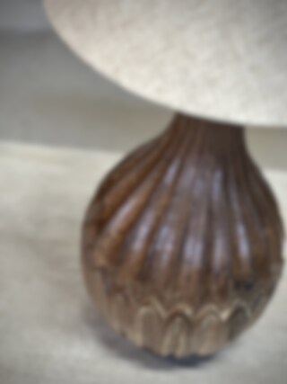 PITI table lamp in light walnut, is made from mango wood. The shade is tapered and made of natural linen. Total hight incl shade 54 cm Lamp Ø 18 x H 35 cm Shade Ø 30/15 x H 21 cm Socklet E 27